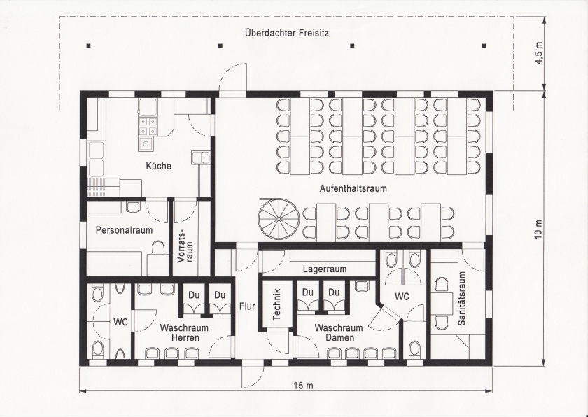 Der Haupteingang ist unter dem überdachten Freisitz. Die Sanitärräume sind auch separat von außen zugänglich.